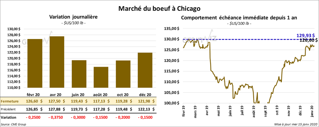 À la fermeture du marché, les contrats de bœuf US aux échéances les plus rapprochées étaient en baisse de plus de 37 cents. Les contrats de veau US ont également été dans le rouge de 45 à 55 cents.