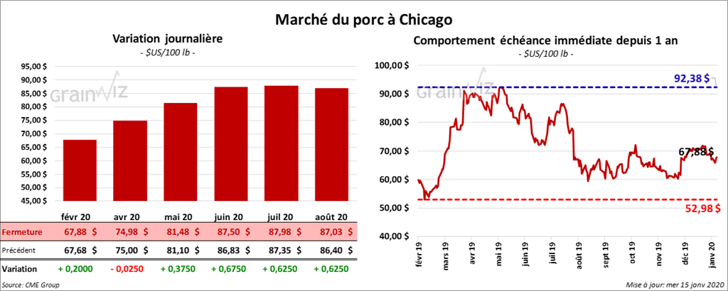 Les contrats de porc US ont terminé la session sur une note partagée. Les contrats février 20 et mai 20 ont clôturé à la hausse de plus de 37 cents alors que celui avril 20 a reculé de 2 cents.