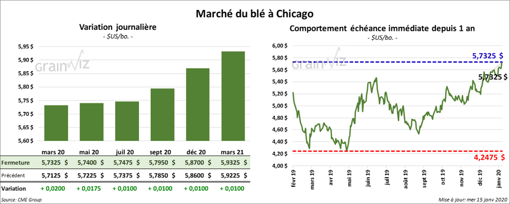 À Chicago, les contrats de blé tendre rouge d’hiver ont clôturé avec des gains de 3 à 4 ¾ cents. À Kansas, ceux de blé dur rouge d’hiver ont terminé la session en baisse de ¾ à ½ cent. À Minneapolis, à la fermeture, les contrats de blé dur rouge de printemps étaient en progression partagée.