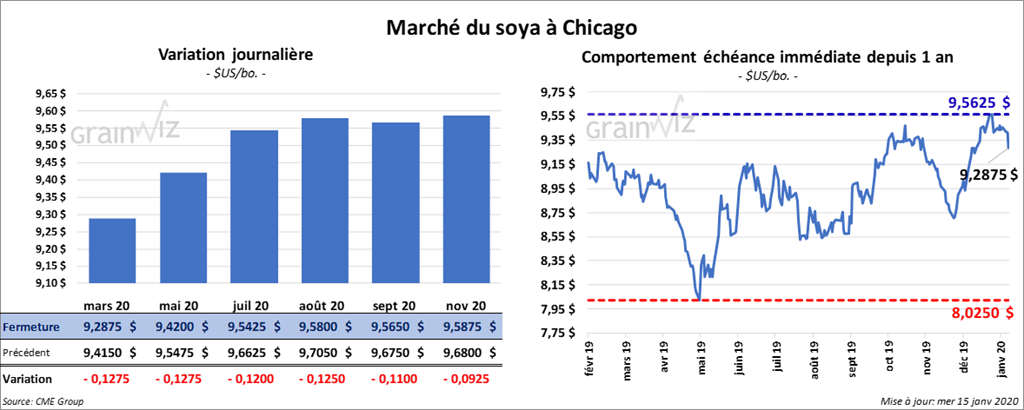 Les contrats de soya US ont fini la journée en baisse de 12 ¾ à 13 ½ cents. Le contrat de tourteau mars 20 a également clôturé dans le rouge de 1,90 $/tonne. L’huile a reculé de 77 points.