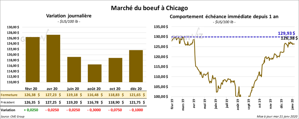 Les contrats de bœuf US ont terminé la journée sur une note partagée. Celui février 20 a pris 2 cents alors que ceux avril 20 et juin 20 ont clôturé en baisse de 2 cents. Les contrats de veau US aux échéances les plus rapprochées ont reculé de 27 à 32 cents.