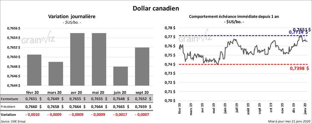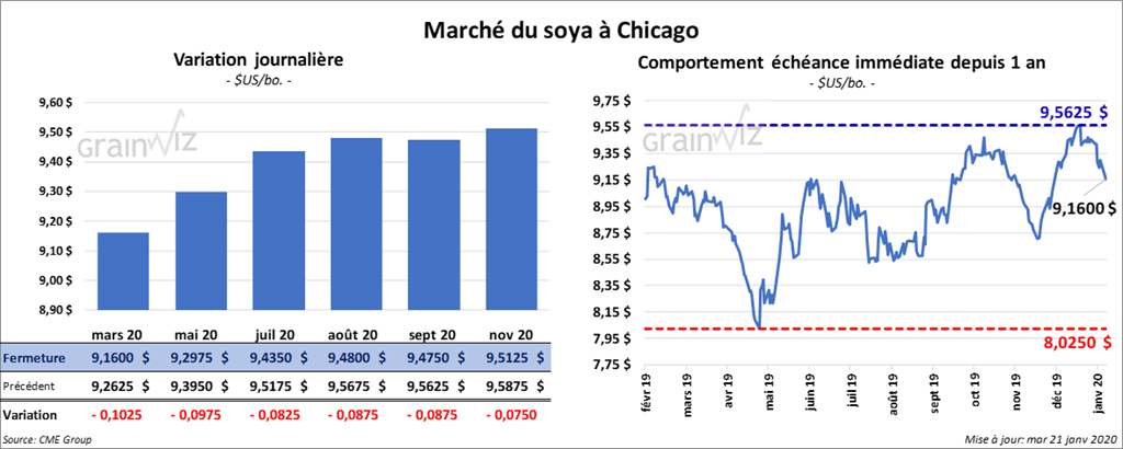 À la fermeture du marché, tous les contrats de soya US étaient en baisse. Celui mars 20 a le plus reculé. Il a terminé la session en baisse de 13 ¾ cents. Les autres contrats aux échéances les plus rapprochées ont perdu entre 11 ¼ et 13 ¼ cents. Le tourteau de soya US a reculé de 1,50 $/tonne. L’huile de soya a été plus ferme, mais a tout de même fini en baisse de 60 points.