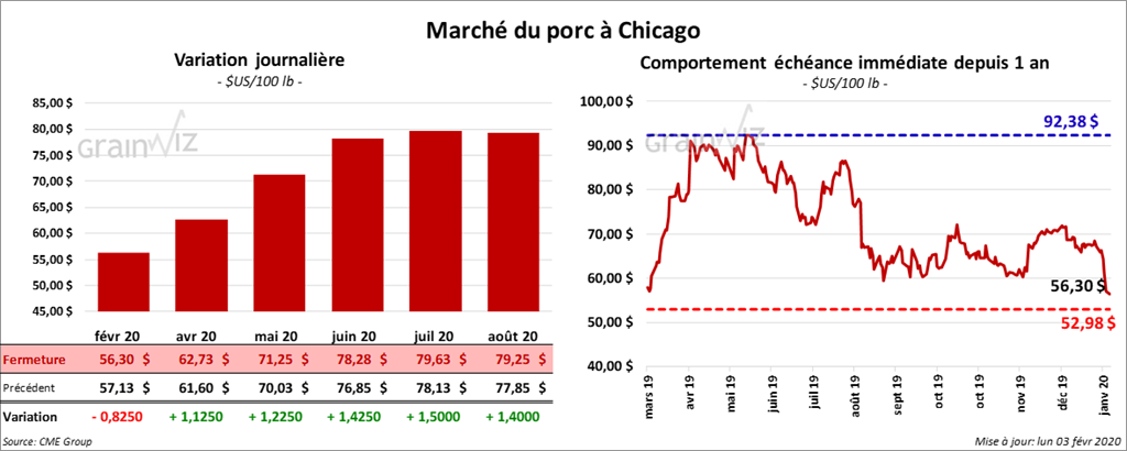 À Chicago, le contrat de porc février 20 a fini la séance en baisse de 82 cents. Les autres contrats aux échéances les plus rapprochées étaient en hausse de 1,12 à 1,22 $.