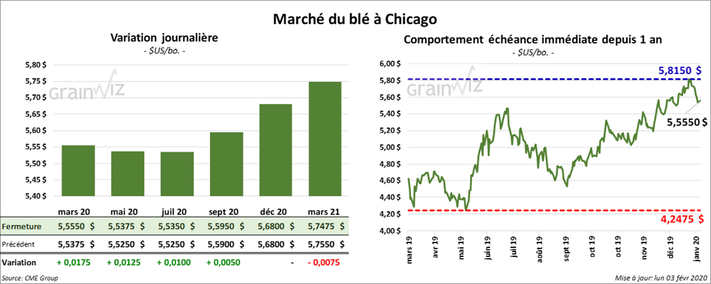 À Chicago, les contrats de blé aux échéances les plus rapprochées ont terminé la journée avec des gains de 1 à 1 ¾ cents. À Kansas, les contrats de blé dur rouge d’hiver ont fini la séance en hausse de ½ à 1 ¼ cents. Les contrats de blé de printemps US aux échéances les plus rapprochées ont clôturé sur une note partagée. Le contrat mars 20 était en baisse alors que celui juillet 20 filait en hausse.