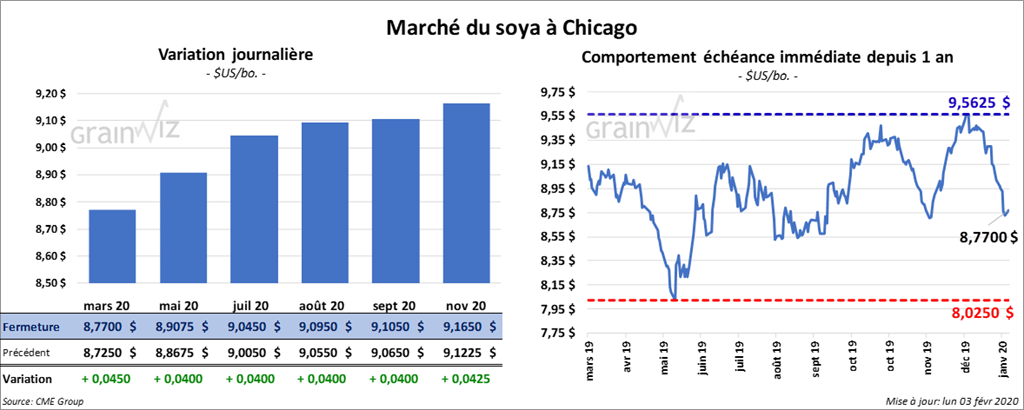Les contrats de soya US ont fini la session en hausse de 4 à 4 ½ cents. Le contrat de tourteau de soya US mars 20 a reculé de 1,20 $/tonne. L’huile de soya US a gagné 35 cents.