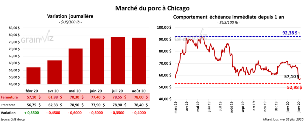 Les contrats de porc US ont terminé la session sur une note partagée. Le contrat février 20 a clôturé en baisse de 4 cents. Les contrats avril 20 et mai 20 ont reculé respectivement de 45 et 60 cents.
