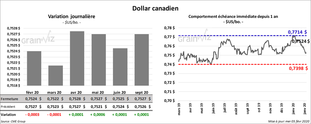 Le rapport de Statistique Canada montre les inventaires de canola canadien ont été de 14,271 millions de tonnes au 31 décembre dernier, ce qui était une baisse plus forte que prévu (0,347 million de tonnes). Les stocks de soya canadien au 31 décembre dernier ont également baissé sur une base annuelle de 9,42 % à 3,874 millions de tonnes.