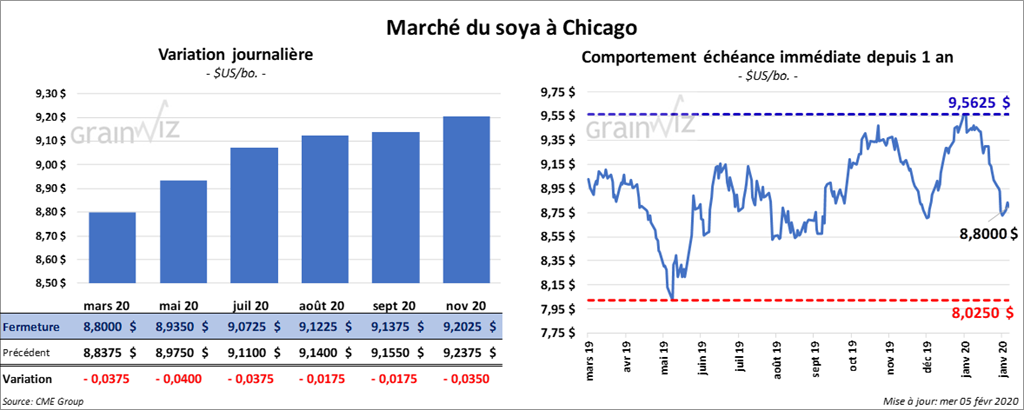 Selon le USDA, les exportations mensuelles de soya US ont été en baisse de 20,48 % à 204,67 millions de boisseaux au cours du mois de décembre dernier. Il s’agissait par contre d’une augmentation annuelle de 38,75 %. Les expéditions vers la Chine ont été de 2,626 millions de tonnes, ce qui était une baisse de 38,06 % par rapport à novembre dernier. Les exportations de tourteau de soya US ont été de 1,017 millions de tonnes au cours du mois de décembre 2019, ce qui correspondait à une baisse annuelle de 2,42 %. Les exportations d’huile de soya US ont totalisé 83,579 tonnes au même mois. Il s’agissait également d’une augmentation annuelle de 16,8 %.