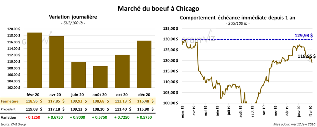 La plupart des contrats de bœuf à Chicago ont terminé la journée en hausse de 57 à 80 cents. Cependant, le contrat février 20 a clôturé avec des pertes de 12 cents. Les contrats de veau US ont fini la session avec des gains de 37 à 57 cents.