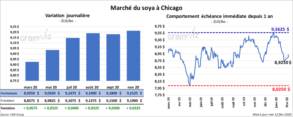 Le contrat de soya US mars 20 a fini la journée en hausse de 7 ¾ cents. Les autres contrats aux échéances les plus rapprochées ont également clôturé avec des gains de 4 ¼ à 6 ¼ cents. Le tourteau de soya US a terminé la séance en progression de 90 cents/tonne. Le contrat d’huile de soya US mars 20 a gagné 31 points.