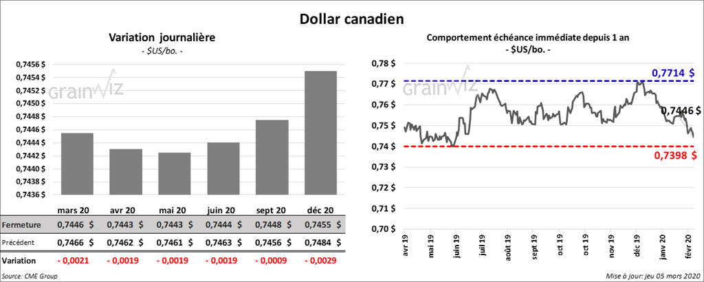Ce matin, le USDA a présenté son rapport hebdomadaire sur les ventes à l’exportations de la semaine du 27 février dernier. Dans le cas du maïs US, il estime qu’elles ont été de 765,069 tonnes, un résultat qui se situe dans la fourchette inférieure des anticipations du marché. Il s’agissait également d’une baisse hebdomadaire de 11 % et d’une réduction annuelle de 20,7 %. Les ventes de la nouvelle récolte ont été estimées à 100,032 tonnes, ce qui était dans la fourchette supérieure des attentes du marché. Pour la semaine, les expéditions de maïs US ont été de 884,613 tonnes, soit une augmentation de 18,9 % comparativement à la même période l’an dernier. Les 34,826 millions de boisseaux de maïs US exportés durant la semaine ont poussé le cumulatif annuel à 566,123 millions de boisseaux, soit à 66,92 % de moins que la projection du USDA établie dans le dernier rapport WASDE.