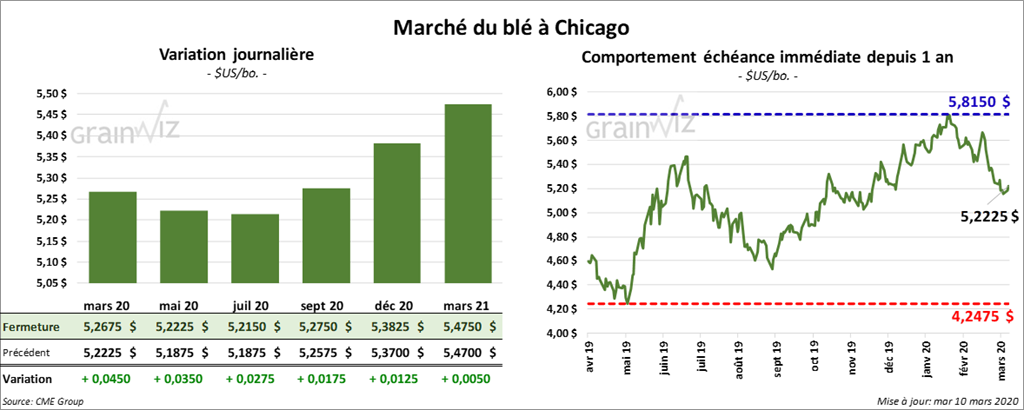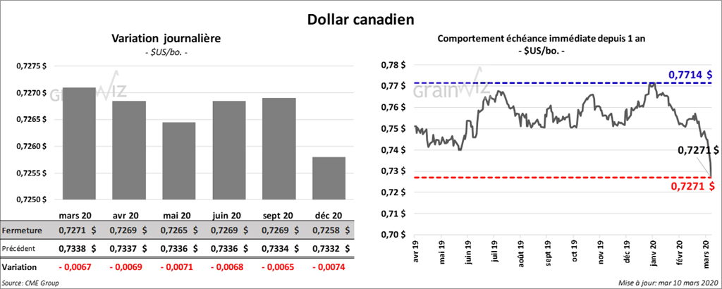 Dans son rapport mensuel d’offre et de demande, le USDA indique que mondialement, les inventaires de fin d’année sont de 287,14 millions de tonnes, ce qui correspond à une baisse par rapport aux attentes des marchés, qui se situaient à 288,47 millions de tonnes. La majeure partie de cette réduction vient de celle de l’Australie. Pour cette dernière, la production a été vue en baisse de 400,000 tonnes par rapport à février dernier. À noter que les exportations de blé australien sont estimées en recul de seulement 200,000 tonnes. Par contre, les productions de blé russe et argentin sont en hausse. Toujours mondialement, les exportations de blé ont augmenté de 180,000 tonnes comparativement à février 20.
