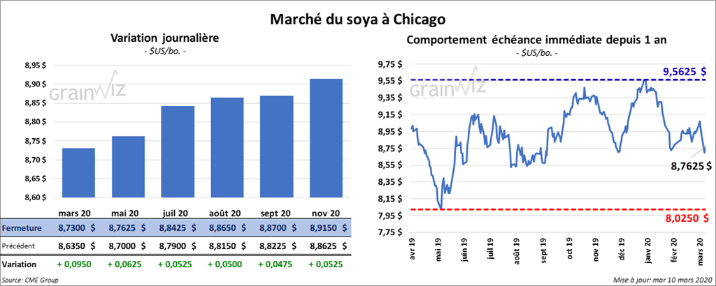 Malgré une journée volatile, les contrats de soya US ont terminé en hausse de 5 à 9 ½ cents. Le contrat de tourteau de soya US mai 20 a fini dans le vert par 1,50 $/tonne. L’huile de soya US a clôturé en progression de 13 points.