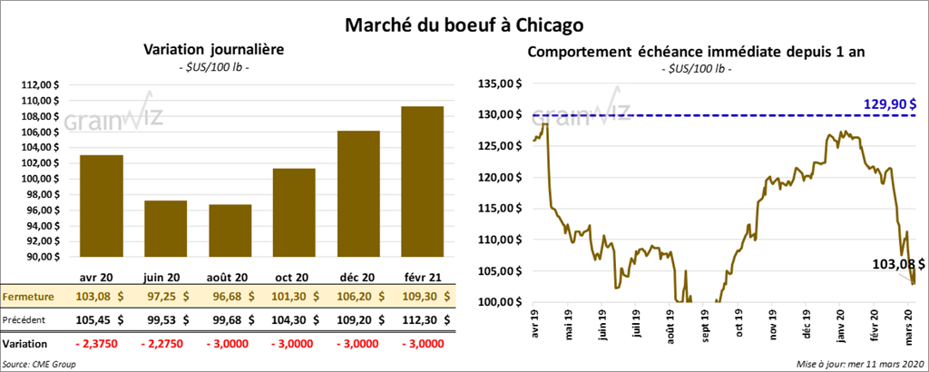 Les contrats différés de bœuf US ont fini la journée à leurs limites à la baisse. Les contrats avril et juin 20 ont reculé respectivement de 2,37 à 2,27 $. Les contrats de veau US aux échéances les plus rapprochées ont aussi terminé à leurs limites à la baisse, mais les contrats mars et avril 20 ont clôturé dans le rouge de 4,425 $.