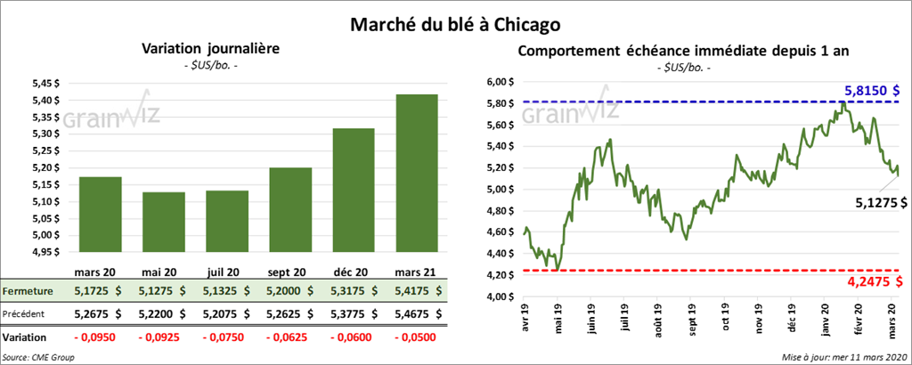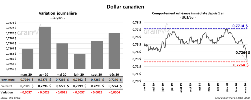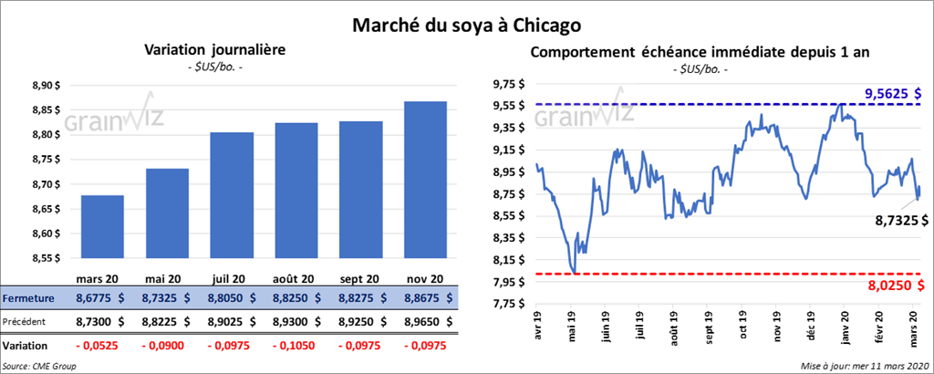Les contrats de soya US ont clôturé en baisse de 3 à 4 cents. Le contrat mars 20, qui expira vendredi, a fini avec une perte de 5 ¼ cents. Dans le cas du tourteau de soya US, le contrat mai 20 a terminé la journée en hausse de 30 cents/tonne. Le contrat d’huile mai 20 a quant à lui fini dans le rouge de 14 points.