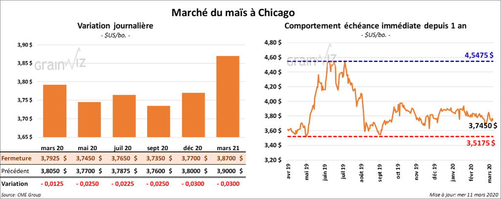 Les contrats de maïs US aux échéances les plus rapprochées ont terminé la session en baisse de 3 à 3 ½ cents. Le contrat mars 20, qui expira vendredi, a reculé d’une fraction de cent.