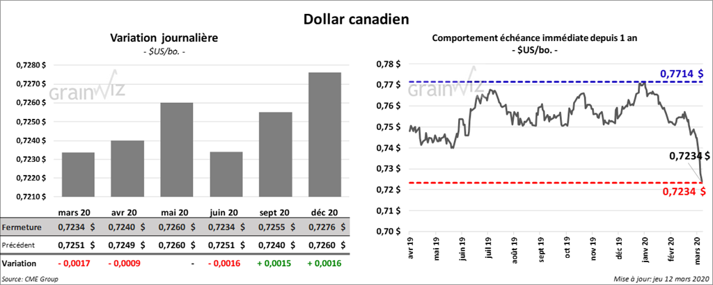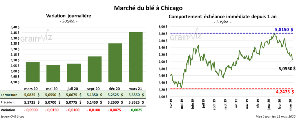 Les contrats de blé US ont clôturé en baisse aux trois places de marché. À Chicago, le recul a été plus prononcé. Les contrats ont perdu entre 6 ½ et 9 cents. À Kansas, les contrats de blé dur rouge d’hiver ont baissé de 2 ¾ à 3 cents. Les contrats de blé de printemps US ont fini la session dans le rouge de 2 ½ à 3 cents, mais le contrat de blé dur rouge de printemps mars 20 est demeuré à 4,99 $ ¼. Les contrats mars 20 vont expirer demain.