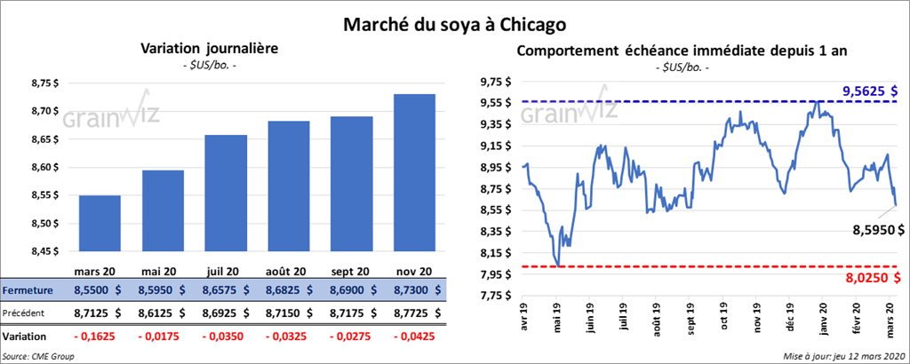 Les contrats de soya US ont fini la journée en baisse de 12 ¾ à 14 ¼ cents. Le contrat de tourteau de soya US mai 20 a gagné 1,20 $/tonne. Le contrat d’huile de soya US mai 20 a perdu 115 points.