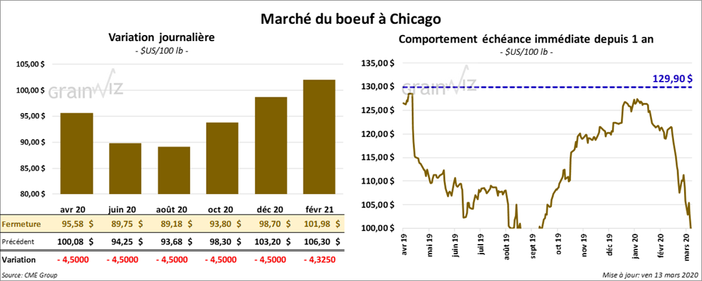 Le 12 mars dernier, le CME Feeder Cattle Index était en baisse de 3,13 $ à 127,91 $.