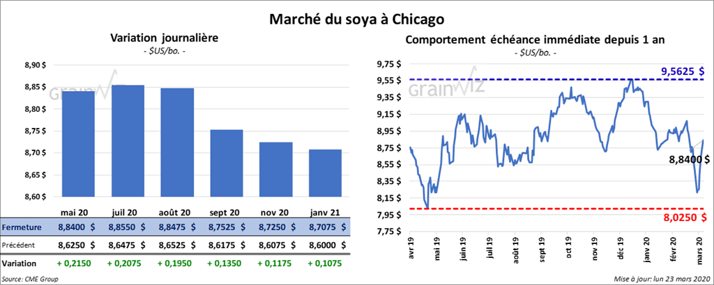 Les contrats de maïs US ont terminé la journée sur une note partagée. Le contrat juillet 20 a fini inchangé alors que ceux septembre et décembre 20 ont clôturé en hausse à respectivement ½ cent et 1 cent. Par contre, le contrat mai 20 a reculé de ¼ cents.