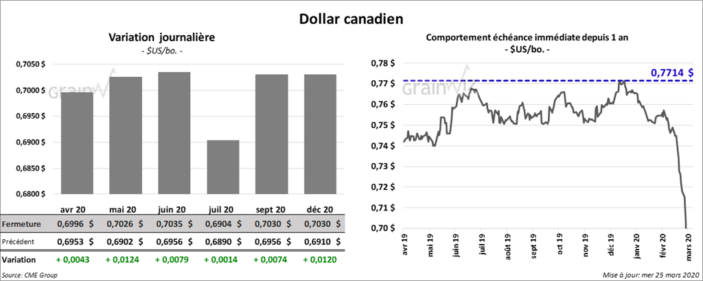 Le contrat de soya US septembre 20 a clôturé en hausse de ¾ cents, mais les autres contrats de soya US aux échéances les plus rapprochées ont terminé avec des pertes de plus de 5 ¼ cents. Le contrat de tourteau de soya US mai 20 a fini la séance en baisse de 10,40 $/tonne. Les autres contrats aux échéances les plus rapprochées ont terminé en baisse entre 1,90 $/tonne et 6,3 $/tonne. L’huile de soya US a clôturé en hausse de 9 à 16 points.