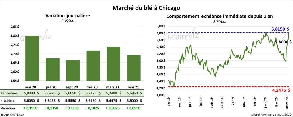 Pour le 1er mars dernier, les analystes prévoient que les stocks de blé US ont été entre 1,4 et 1,5 milliard de boisseaux, ce qui serait une réduction par rapport aux 1,59 milliard de boisseaux comptabilisés l’an dernier à la même période. De plus, pour tous les types de blé US, les marchés anticipent des superficies cultivées entre 44 et 45 millions d’acres. Les sondages indiquent que pour tous les types de blé US, les intentions d’ensemencement pourraient se située entre 44 et 46 millions d’acres. Si cela se réalise, ce sera une baisse annuelle de 0,5 %. Le USDA devrait présenter ses rapports sur les inventaires et les superficies des grains US le 31 mars prochain.