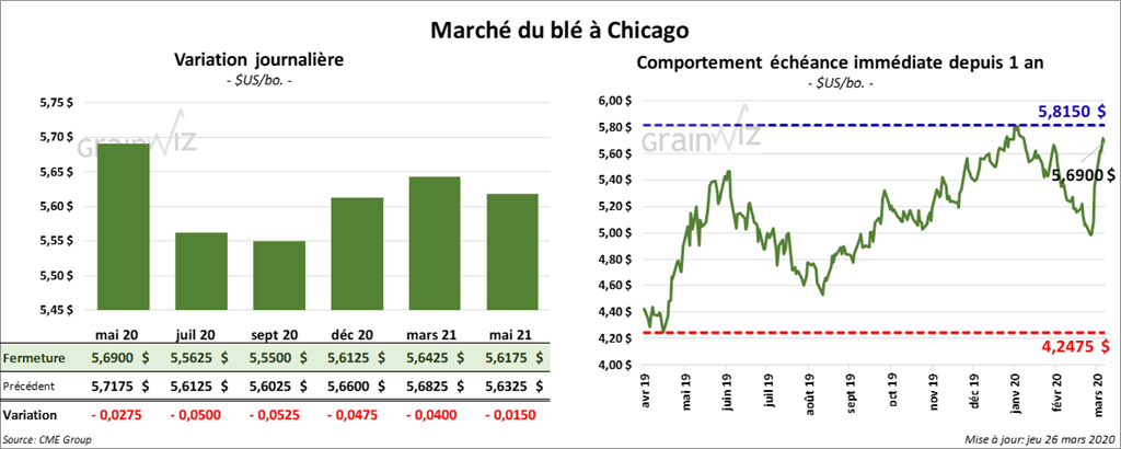 Pour le rapport sur les stocks de blé US au 1er mars dernier, les analystes s’attendent à des inventaires entre 1,4 et 1,5 milliard de boisseaux, ce qui serait une réduction par rapport aux 1,59 milliard de boisseaux de l’an dernier. En ce qui concerne, les intentions d’ensemencements de tous les types de blé US, les marchés projettent qu’ils seront entre 44 et 46 millions d’acres. S’ils se situent à 45 millions d’acres, ce sera une baisse de 0,5 % par rapport à l’an dernier. Les rapports seront présentés le 31 mars prochain.