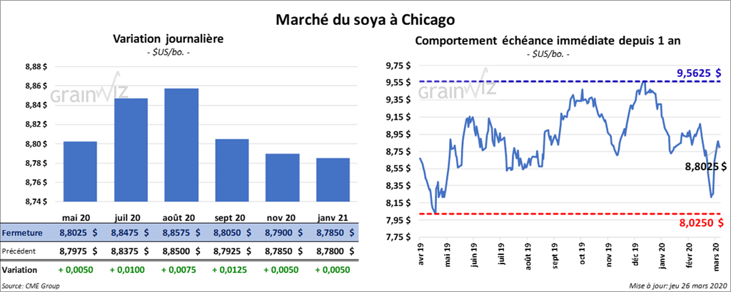 À l’exception de celui septembre 20, qui a gagné ¼ de cent, les contrats de soya US aux échéances les plus rapprochées ont fini la journée en baisse de ¾ à 2 ½ cents. Le contrat novembre 20 a clôturé en hausse. Le contrat de tourteau de soya US mai 20 a terminé la séance avec un gain de 1,30 $/tonne. Le contrat d’huile de soya US mai 20 a fini en baisse de 14 points.