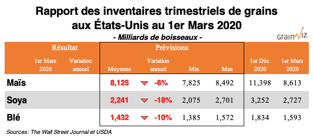 Le USDA présentera également ce mardi son rapport sur les stocks trimestriels de grains américains au 1er mars dernier. Pour tous les grains, avec les mauvaises récoltes de 2019, on prévoit que les stocks afficheront de bons reculs. Il restera à valider cependant si des baisses plus importantes ont été enregistrées, reflet d'une meilleure demande que prévue.