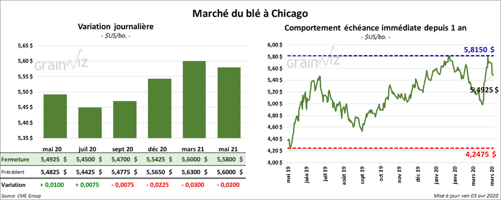 Les contrats de blé tendre rouge d’hiver US ont terminé la journée avec des gains de 7 ½ cents. Sur la semaine, par contre, ils ont perdu 22 cents. À Kansas, le contrat mai 20 a gagné 8 cents. Sur la semaine, il a reculé de 13 ¾ cents. Les contrats de blé de printemps ont pris 5 ½ cents. Sur la semaine, ils ont baissé de 9 ¾ cents.