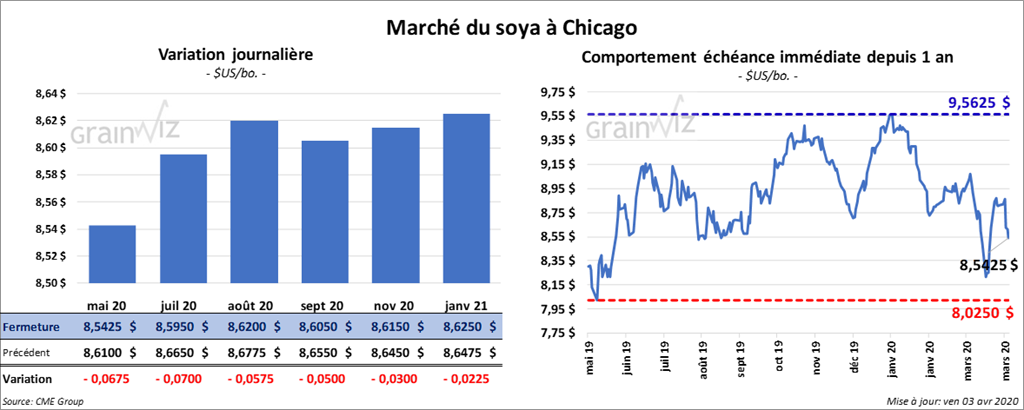 Les contrats de soya US ont fini la session en baisse de 2 à 4 ½ cents. Sur la semaine, le contrat mai 20 a perdu 27 ¼ cents. Le tourteau de soya US a terminé la séance en baisse de 5,90 $/tonne. Sur la semaine, le contrat mai 20 a reculé de 19,90 $/tonne. Quant à l’huile de soya US, elle a clôturé en hausse de 19 points. Sur la semaine, elle a par contre baissé de 42 points.