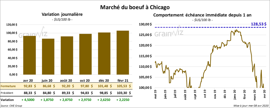 Le contrat de bœuf US avril a terminé la journée à son extension sa limite à la hausse. Les autres contrats aux échéances les plus rapprochées ont fini la session en progression de 1,87 $ à 2,87 $. Les contrats de veau US ont également clôturé dans le vert entre 4,95 $ et 6,55 $.