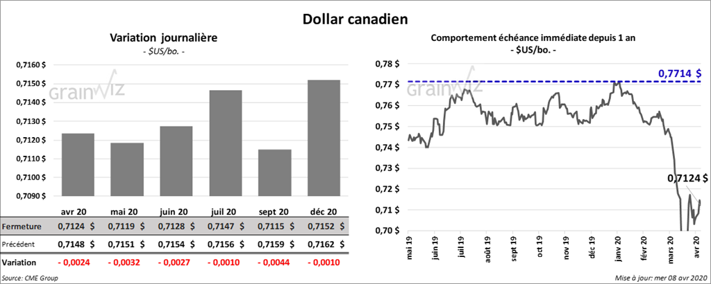 En ce qui concerne, le rapport d’offre et de demande d’avril qui sera rendu public demain, les analystes s’attendent à des inventaires mondiaux en légère baisse comparativement à mars dernier à 287 millions de tonnes. Les marchés prévoient aussi une hausse des inventaires de fin d’année de blé US de 7,4 millions de boisseaux à 947,4 millions de boisseaux.