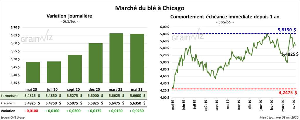 Les contrats de blé US ont terminé la session sur une note partagée, mais la plupart des contrats aux échéances les plus rapprochées ont clôturé en hausse. À Chicago, le contrat de blé mai 20 a fini en recul d’un cent alors que les autres contrats aux échéances les plus rapprochées ont terminée en progression de 1 à 2 cents. Les contrats de blé dur rouge d’hiver ont fermé dans le vert par 4 ½ à 5 ¼ cents. Les contrats de blé dur rouge de printemps ont également fini la journée en hausse de 5 à 5 ½ cents.