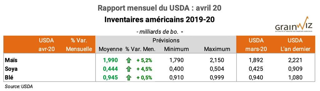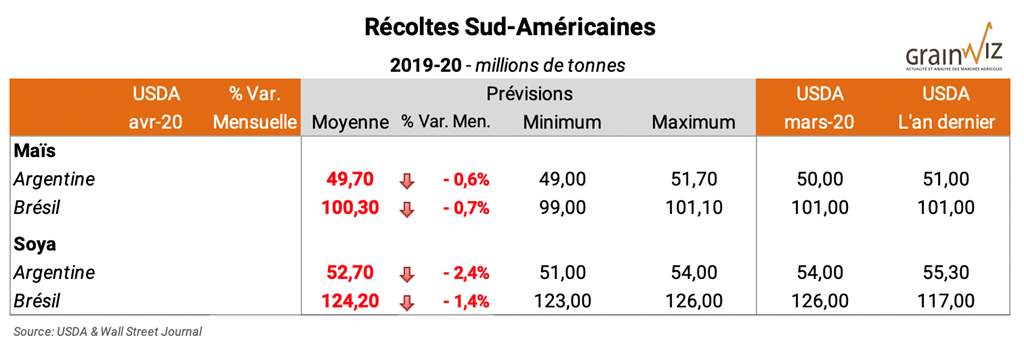 C'est ce jeudi 9 avril à midi que le USDA présentera sa mise à jour sur ses projections d'offre et demande (WASDE). Avec les récents évènements, spécialement du côté du ralentissement de la production d'éthanol aux États-Unis, les marchés anticipent une révision à la hausse des stocks américains de maïs. Par contre, dans le monde, on note que ceux-ci anticipent aussi une réduction des récoltes sud-américaines dans le soya suivant les récentes conditions plus chaudes et sèches.
