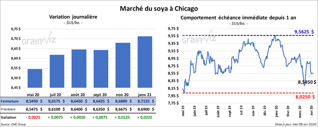 Les contrats de soya US ont fini la session en progression de 8 à 9 ¼ cents. À la fermeture du marché, le contrat de tourteau de soya US mai 20 était en baisse de 30 cents/tonne. Le contrat d’huile de soya US mai 20 a clôturé en hausse de 23 points.