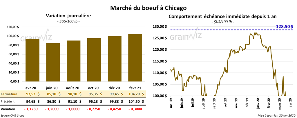 Les contrats de bœuf US ont terminé la session en baisse de 40 cents à 1,50 $. Celui avril 20 a été le plus faible. Les contrats de veau US ont aussi fini dans le rouge de plus de 2,00 $.