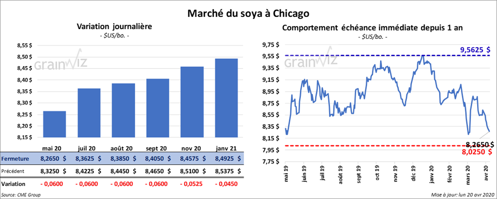 Les contrats de maïs US ont terminé la journée dans le rouge et le contrat mai 20 a été le plus faible. La chute du prix du pétrole US sous zéro a alimenté les liquidations. À la fermeture du marché, le contrat de maïs US mai 20 avait reculé de 8 ½ cents.
