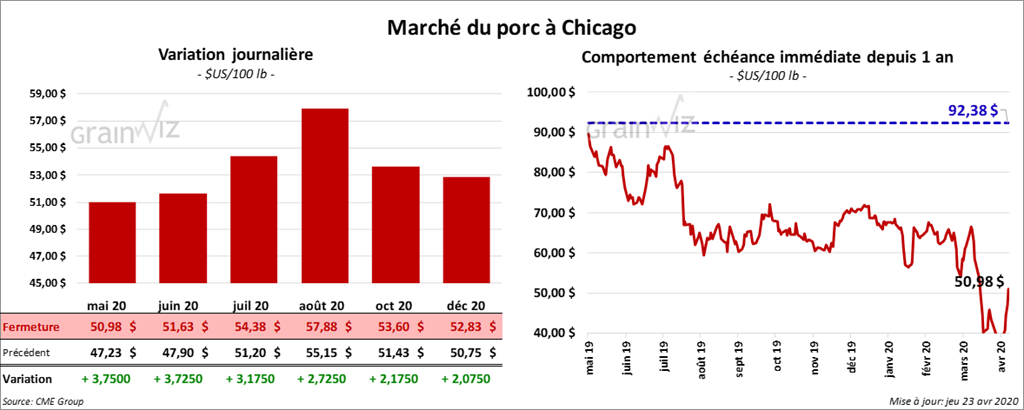 Les contrats de porcs US ont terminé la séance en hausse par trois chiffres. Ceux aux échéances les plus rapprochées ont progressé le plus. Le contrat mai 20 a d’ailleurs fini à sa limite à la hausse.