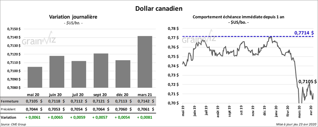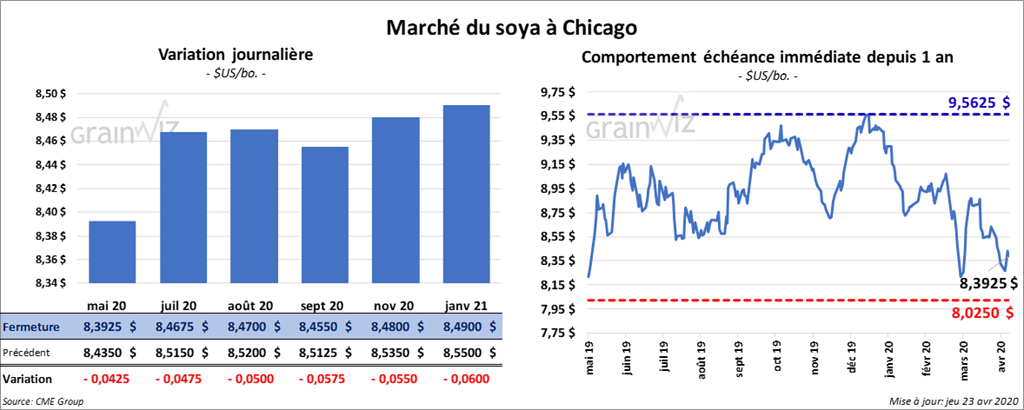 Les contrats de soya ont terminé la journée en hausse et ceux aux échéances les plus rapprochées ont été les plus forts. Les contrats mai 20 et août 20 ont clôturé en progression de 3 ¾ à 4 ½ cents. Ceux septembre 20 et novembre 20 ont fini dans le vert d’une fraction à 2 ½ cents. Le contrat mars 2021 a tout de même fini en baisse de 2 cents. Le contrat de tourteau de soya US mai 20 a fermé en hausse de 40 cents/tonne. Les contrats d’huile de soya US aux échéances les plus rapprochées ont fini en progression de 4 à 6 points.