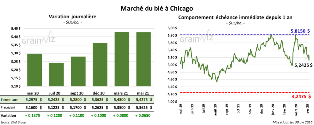 Les contrats de maïs US ont terminé la session en hausse. Cette dernière a été plus forte pour les contrats aux échéances les plus rapprochées. Ceux mai 20 et juillet 20 ont gagné plus de 5 cents. Par contre, les gains ont été limités à 2 ½ cents pour le contrat juillet 21.