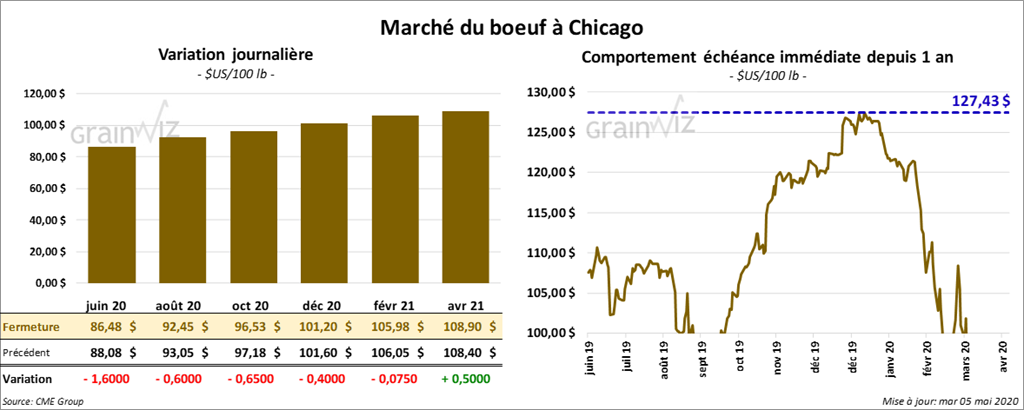 Les contrats de bœuf US ont terminé la session en baisse de 40 cents à 1,60 $. Le contrat de veau US mai 20 a fini en hausse de 52 cents, mais les autres contrats aux échéances les plus rapprochées ont clôturé en baisse de 2 à 72 cents.