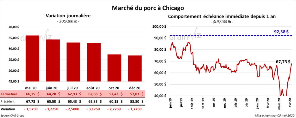 Sous la pression des prises de profits, les contrats de porc US ont fini la journée en baisse. Le contrat août 20 a reculé le plus avec une perte de 3,17 $ à 62,67 $. Les autres contrats aux échéances les plus rapprochées ont baissé de 1,22 $ à 2,75 $.