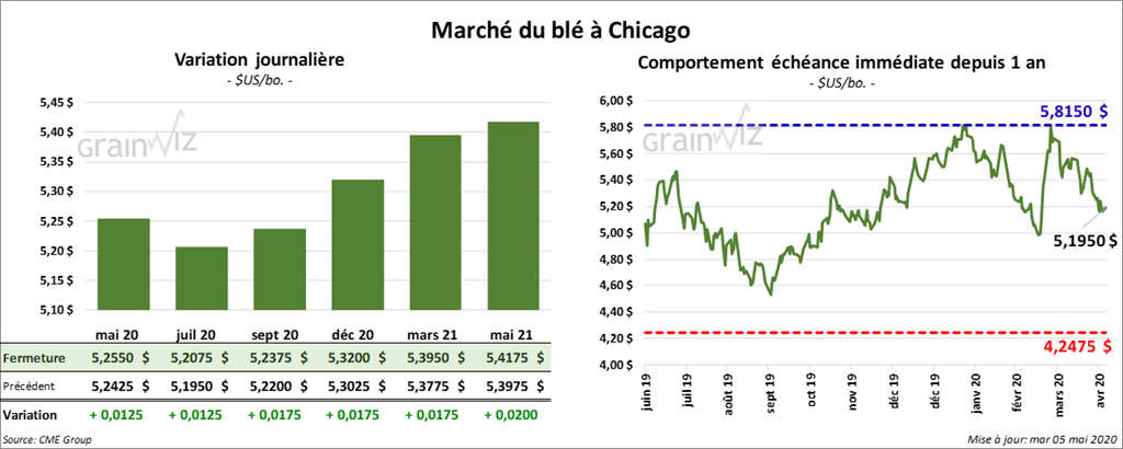 Le contrat de blé tendre rouge d’hiver US a terminé la journée à 5,25 ½ $. Les autres contrats aux échéances les plus rapprochées ont fini dans le vert de 1 ¼ à 1 ¾ cents. À Kansas, les contrats de blé ont clôturé en baisse de 2 ½ à 3 ¼ cents. Les contrats de blé de printemps US ont fini la session avec des pertes. Les contrats de blé dur rouge de printemps US juillet 20 jusqu’à mars 21 ont clôturé en baisse de 1 ¾ à 37 ¼ cents.