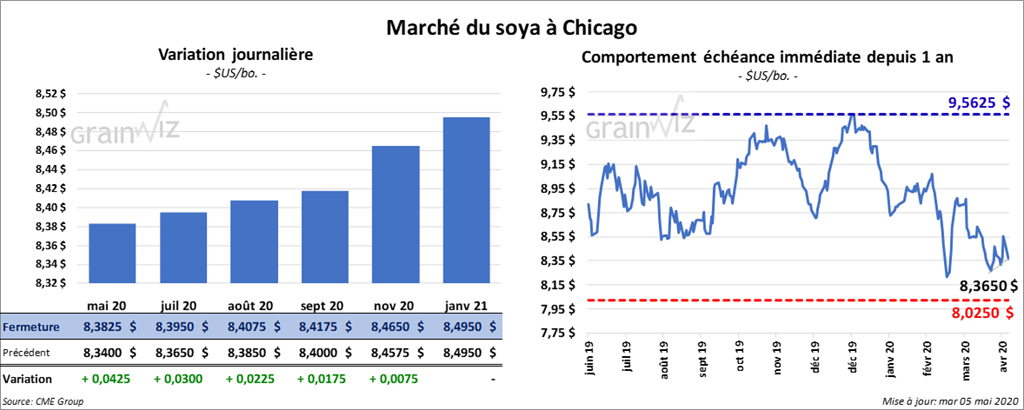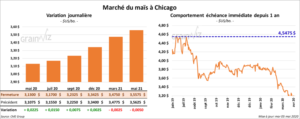 Les contrats de maïs US 2020 ont terminé la session avec des gains alors que ceux de 2021 ont clôturé avec des pertes. Le contrat décembre 20 a fini la journée en hausse de ¼ cent.