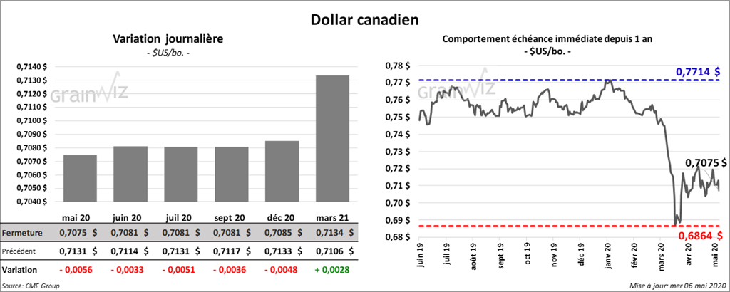 Les contrats de blé US ont terminé la journée en baisse de plus de 6 ½ cents. Ceux de blé dur rouge d’hiver ont été les plus faibles. Le contrat de blé dur rouge d’hiver mai 20 a clôturé dans le rouge à 4,67 ½ $. Son expiration est prévue pour jeudi prochain. En fait, les autres contrats de blé dur rouge d’hiver US ont terminé en recul de 2 ¾ à 3 ¼ cents. Le contrat de blé tendre rouge d’hiver juillet 20 a fini la session en baisse de 3 ¼ cents. Ceux de blé dur rouge de printemps ont clôturé dans le rouge entre 2 ¼ et 2 ¾ cents.