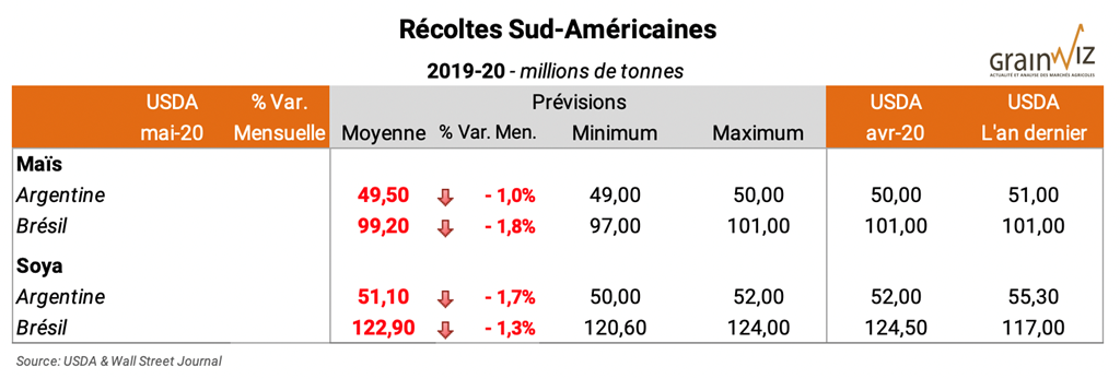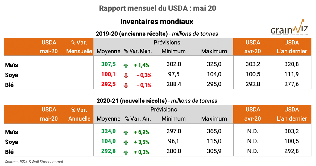 - C'est avec la publication de son rapport mensuel de mai que le USDA propose ses 1eres projections d'offre et demande pour la prochaine année (2020-21).
