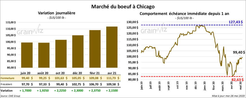 - Le 25 mai dernier, le CME Feeder Cattle Index était en baisse de 52 cents à 126,44 $.