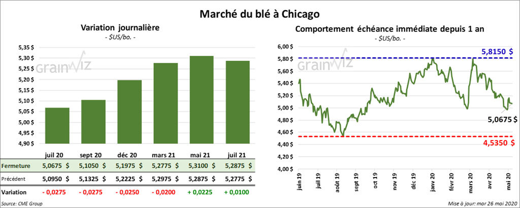 Les contrats de blé US ont fini la journée sur une note partagée. À Chicago, ceux de blé tendre rouge d’hiver ont reculé de 1 à 2 cents. À Kansas, les contrats de blé US ont terminé en hausse de 1 ¾ à 3 ¾ cents. Les contrats de blé de printemps US ont clôturé dans le vert par 2 à 4 ¾ cents.