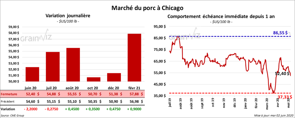 Les contrats de porc US juin 20 et juillet 20 ont terminé la journée en baisse de plus de 2,20 $. Les autres contrats aux échéances les plus rapprochées ont fini en hausse de 45 à 90 cents.